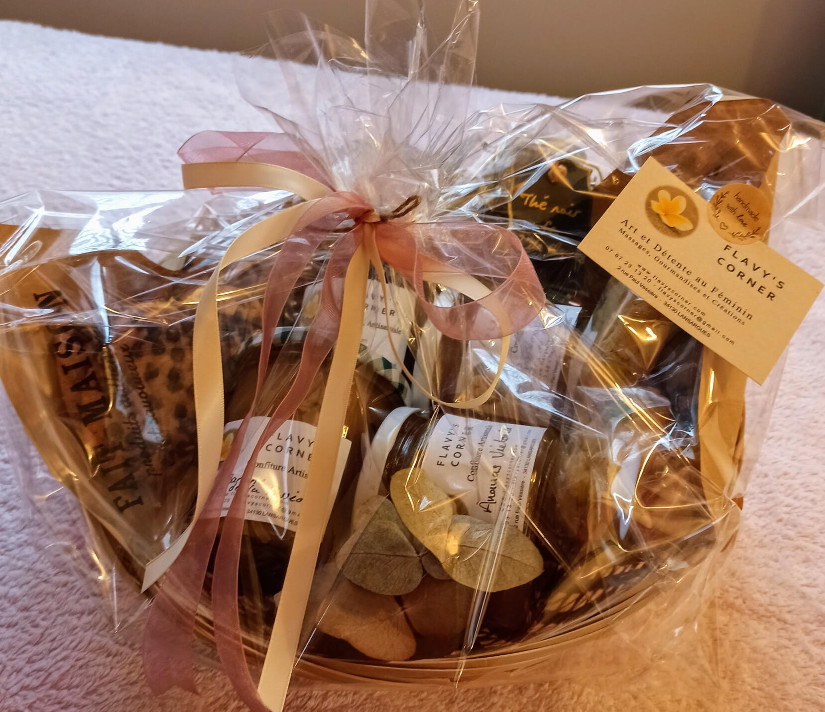 Boite de 6 muffins cœur coulant (chocolat, mangue verveine, framboise, etc.) : 10€Panier gourmand composé de 7 produits (4 confitures, 2 sachets de cookies, 1 mélange de thé) : 48€